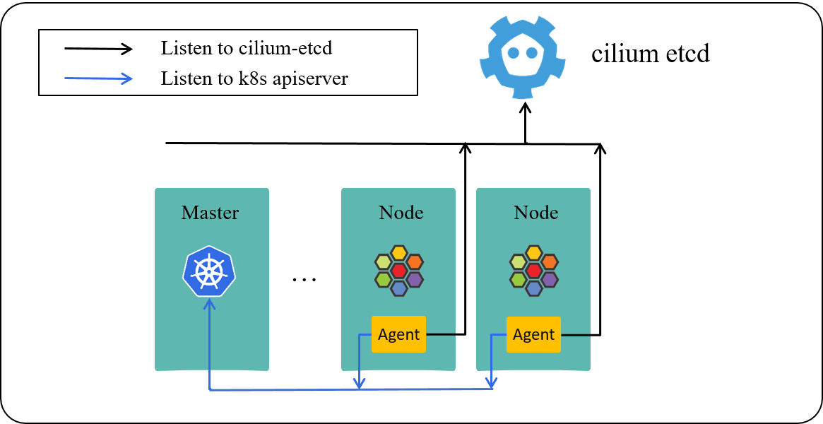 In a large Cilium-powered Kubernetes cluster, there is a central repository (kvstore) that all Cilium agents will connect to. While Cilium supports several types of kvstores, the most oftenly used is etcd.